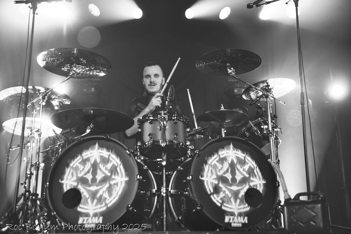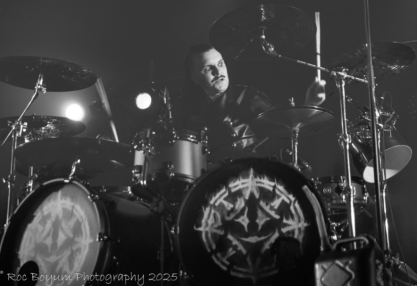 Drummer John Alfredsson had a very unique and interesting drumkitsetup with his main double bass drum split in the middle on two separate wheeled platforms that were at opposite ends of the stage and joined together to create his complete kit.