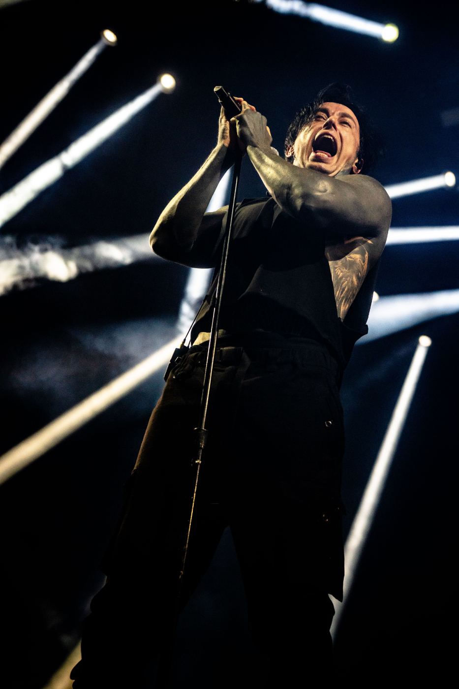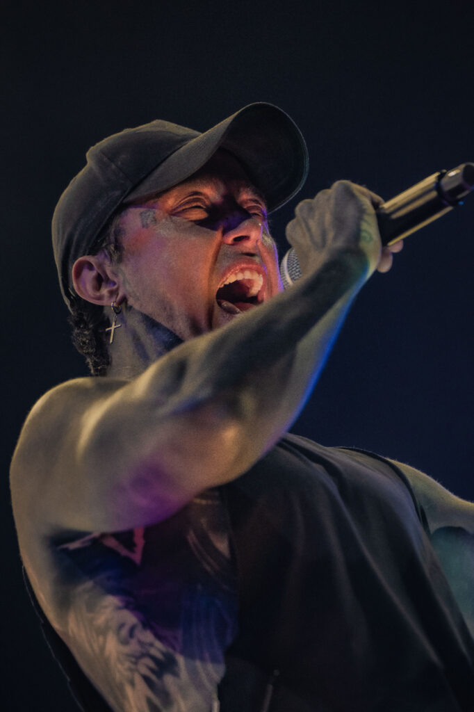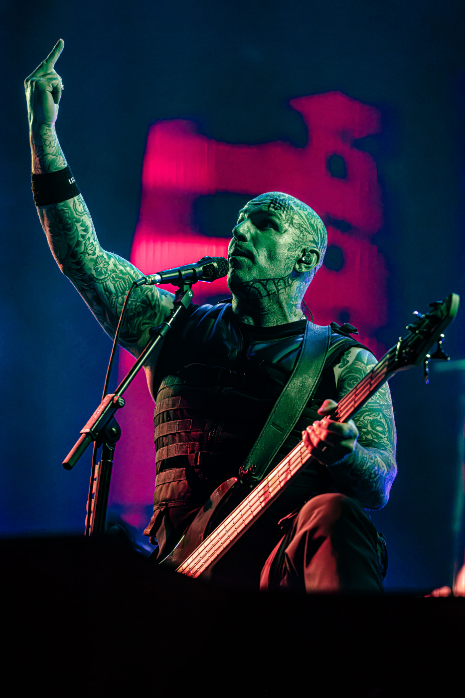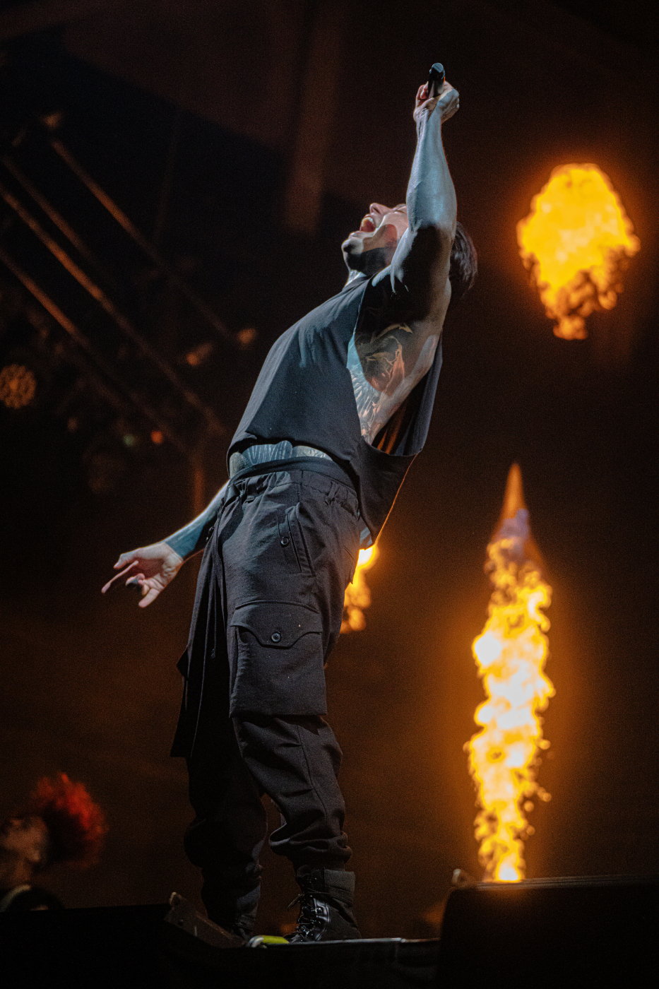 When the lights dimmed for the headliner, a massive screen illuminated with an engaging backstage video showcasing the band getting pumped and making their way to the stage. The excitement reached an exhilarating climax as the footage abruptly cut to black, and the band burst forth in a spectacular display of lights and pyrotechnics. Frontman Ronnie Radke quickly showcased his hip-hop swagger, diving straight into the opening track “Prequel,” from their highly successful 2024 Popular Monster release which was the LP most represented this night and served musically as a powerful declaration of their intent.