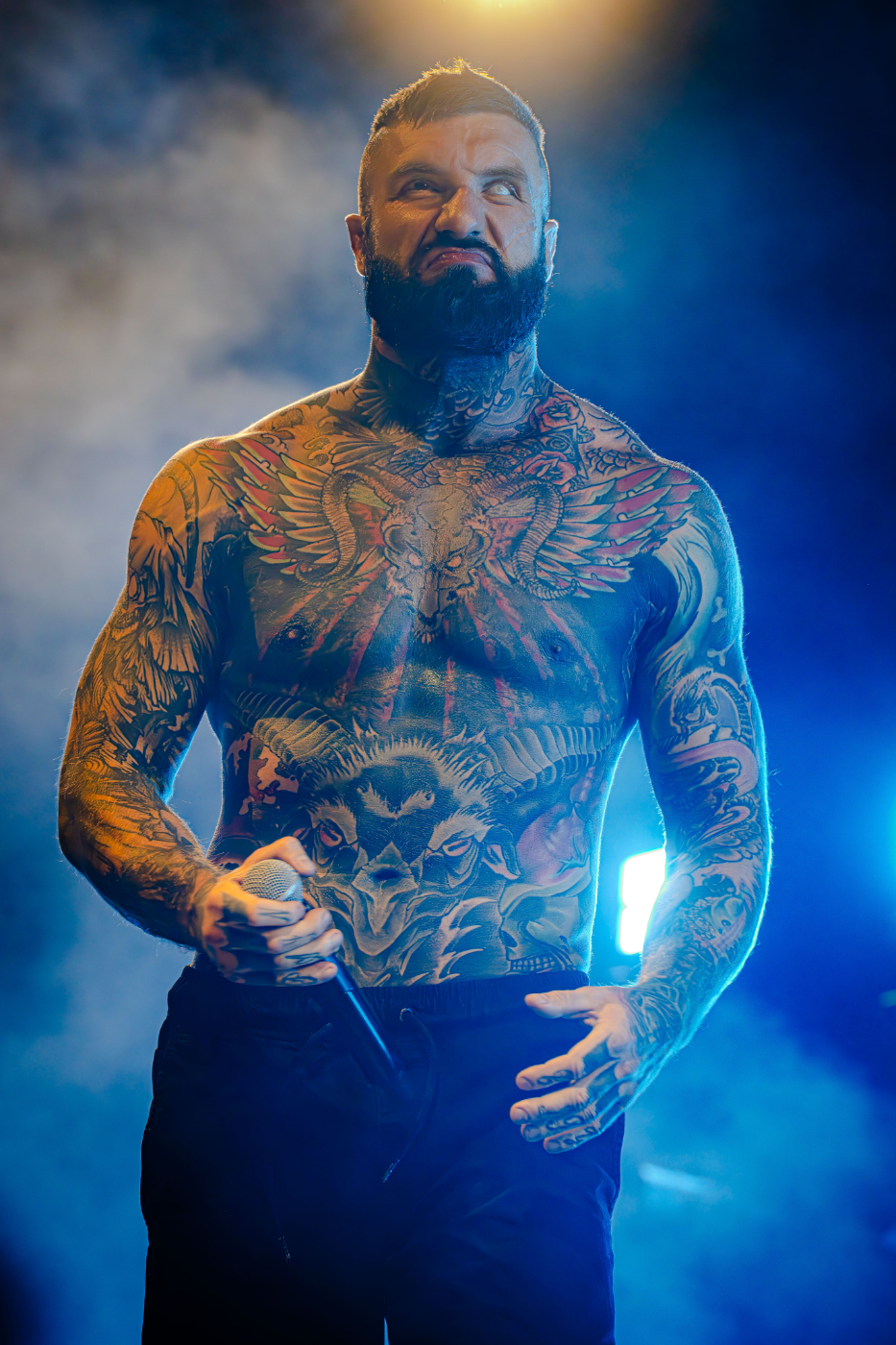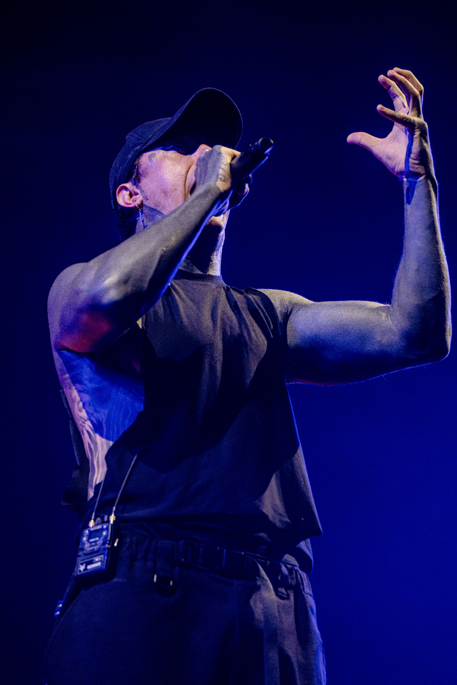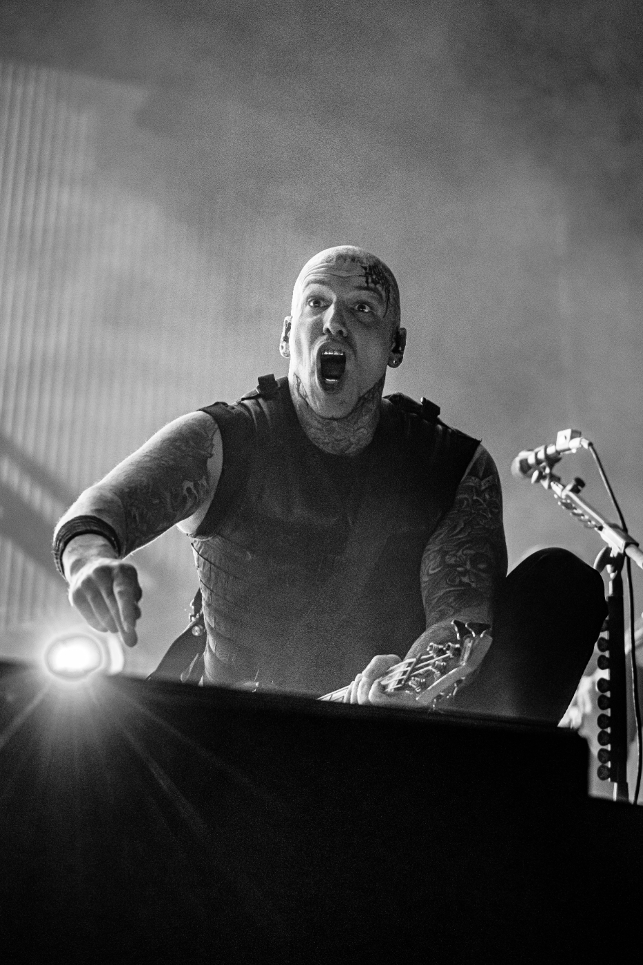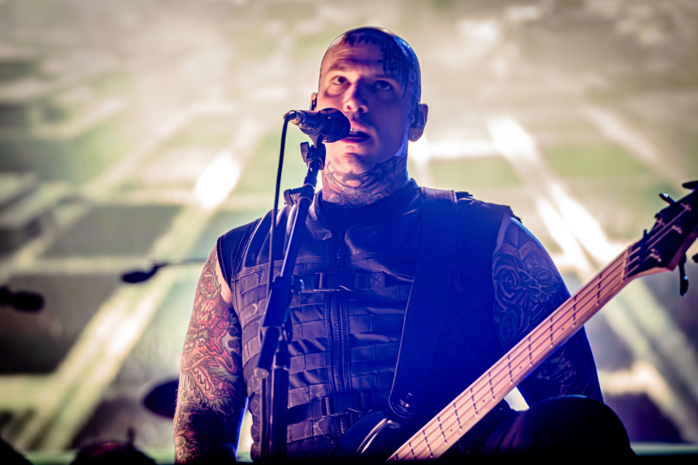 When the lights dimmed for the headliner, a massive screen illuminated with an engaging backstage video showcasing the band getting pumped and making their way to the stage. The excitement reached an exhilarating climax as the footage abruptly cut to black, and the band burst forth in a spectacular display of lights and pyrotechnics. Frontman Ronnie Radke quickly showcased his hip-hop swagger, diving straight into the opening track “Prequel,” from their highly successful 2024 Popular Monster release which was the LP most represented this night and served musically as a powerful declaration of their intent.