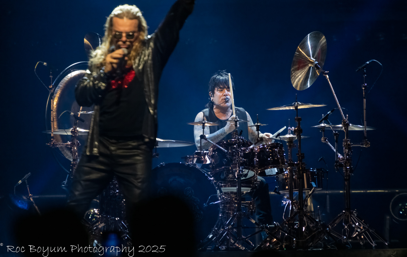 The Phoenix audience enjoyed a thrilling performance featuring a set of twelve songs from the main stage, culminating in an electrifying drum solo by Alex Gonzalez. His display of speed, skill, stick twirls, and tosses showcased his ambidextrous talents, leaving the audience in awe. After completing his solo, Gonzalez stepped out onto the extended runway to express his gratitude to the crowd, receiving an enthusiastic standing ovation in return. He concluded his appearance by tossing his drumsticks to the audience before exiting the stage.